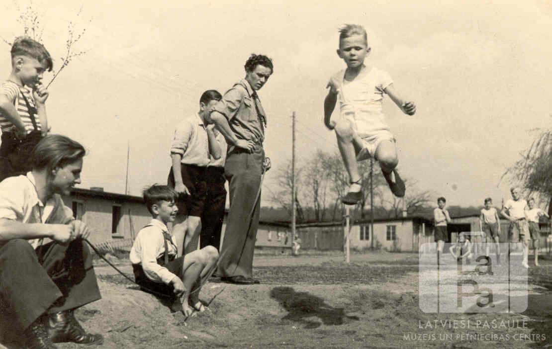 Vitauts Vītoliņš lec tāllēkšanā Burtnieku 71. skautu vienības mazskautu un skautu vieglatlētikas sacensībās Junkersa nometnē Kaselē (amerikāņu zonā). Blakus un aizmugurē ir skatītāji. Fonā ir nometnes dzīvojamās barakas. No kreisās: piektais H. Ozoliņš (skautu vadītājs; formastērpā un ar lenti rokās), sestais Vitauts Vītoliņš.