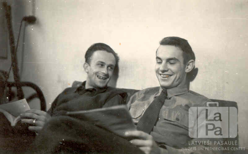 Divi smaidoši draugi no Burtnieku 71. skautu vienības sēž iekštelpās Junkersa nometnē Kaselē (amerikāņu zonā). Jaunekļiem rokās ir grāmatas. No kreisās: Pauls Kuzņecovs (skautu vienības priekšnieks) un Bruno Rubess.