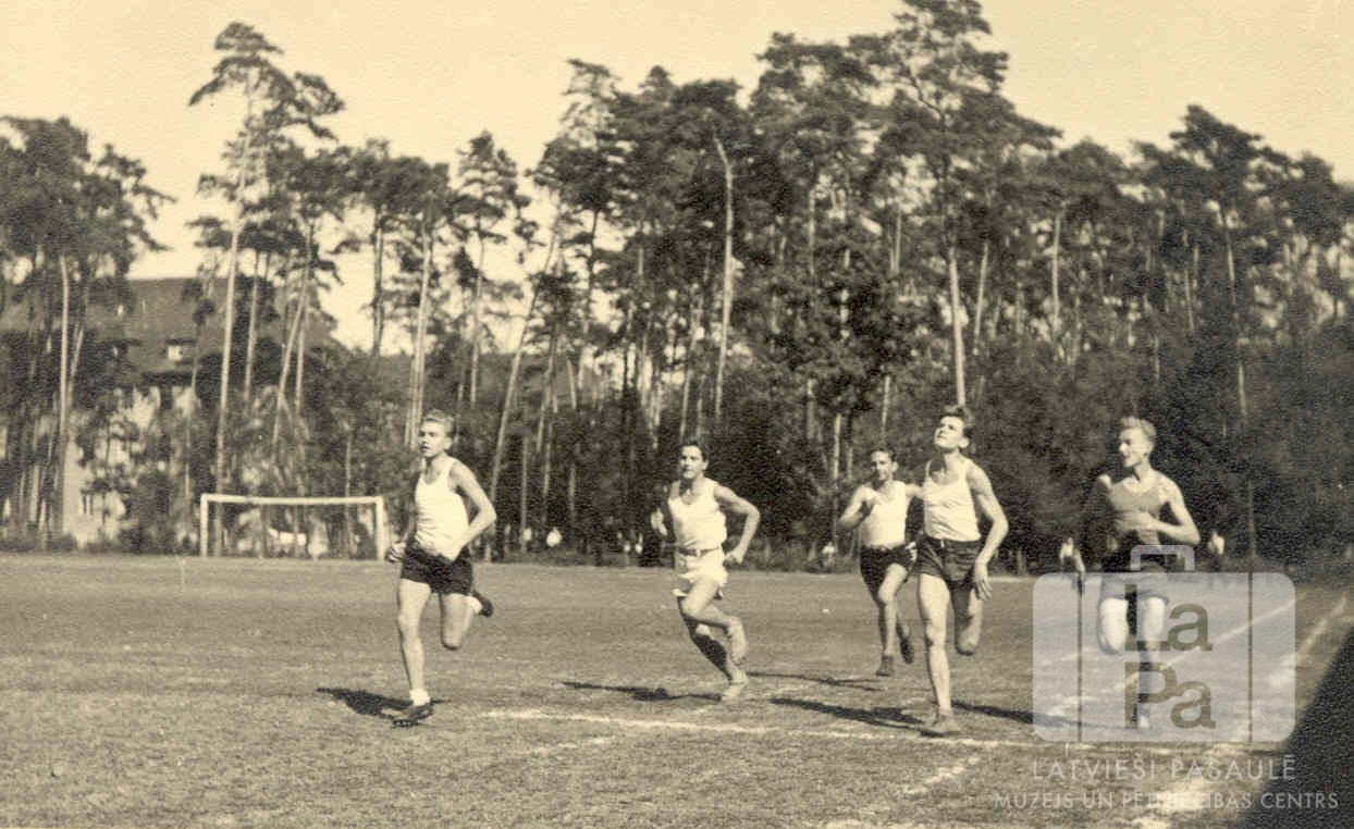 Pieci jaunekļi sporta tērpos sacenšas skriešanā jauniešu vieglatlētikas sacensībās Karlsrūes nometnē (amerikāņu zonā). Puiši skrien pa sporta laukumā iezīmētām skrejceļa līnijām. Fonā ir futbola vārti, mežs un trīsstāvu mūra dzīvojamās ēkas. Priekšā, no kreisās: Uldis Vipulis, Gatis Plūme, Elmārs Vītoliņš, nezināms un Juris Jaunzems.