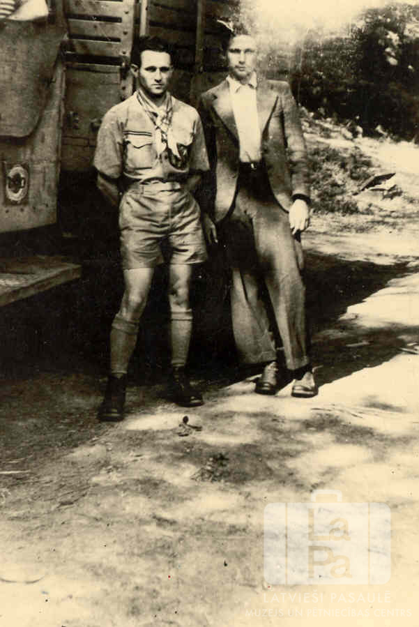 Divi jauni vīrieši saulainā dienā pie smagās automašīnas Junkersa nometnē Kaselē (amerikāņu zonā). No kreisās: R. Strazdiņš (Burtnieku 71. skautu vienības vadītājs formastērpā) un Elmārs Vītoliņš (uzvalkā).