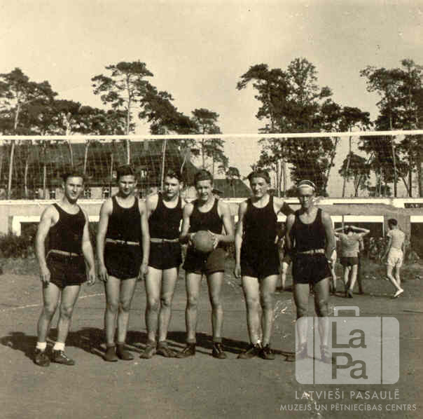 Vīriešu volejbola komanda tumšos sporta tērpos stāv pie tīkla Karlsrūes nometnē (amerikāņu zonā). Viens jauneklis rokās tur bumbu. Fonā otrpus tīklam ir citi spēlētāji pie vienstāvu ēkas, aiz kuras ir priedes un vairākstāvu mūra ēka. Priekšā, no kreisās: Gunārs Tobiāns, Elmārs Vītoliņš, Gatis Plūme, Ojārs Ozols, Jānis Laukirbe un Valdis Kārkls.