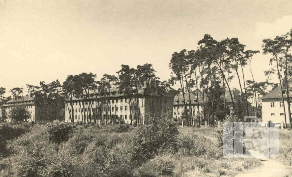 Trīsstāvu bloku dzīvojamās ēkas Karlsrūes nometnē (amerikāņu zonā) 1949. gada vasarā. Priekšplānā ir aizaudzis laukums un priedes.