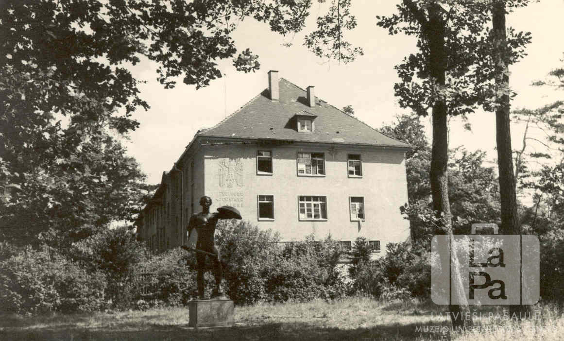 Trīsstāvu bloku dzīvojamā ēka ar pieminekli priekšā Karlsrūes nometnē (amerikāņu zonā) 1949. gada vasarā. Piemineklis priekšā attēlo vīrieti ar zobenu vienā rokā un paceltu vairogu otrā rokā. Ēkas trešā satāva logs bija Vītoliņu ģimenes istabas logs. Apkārt ir krūmi un koki.