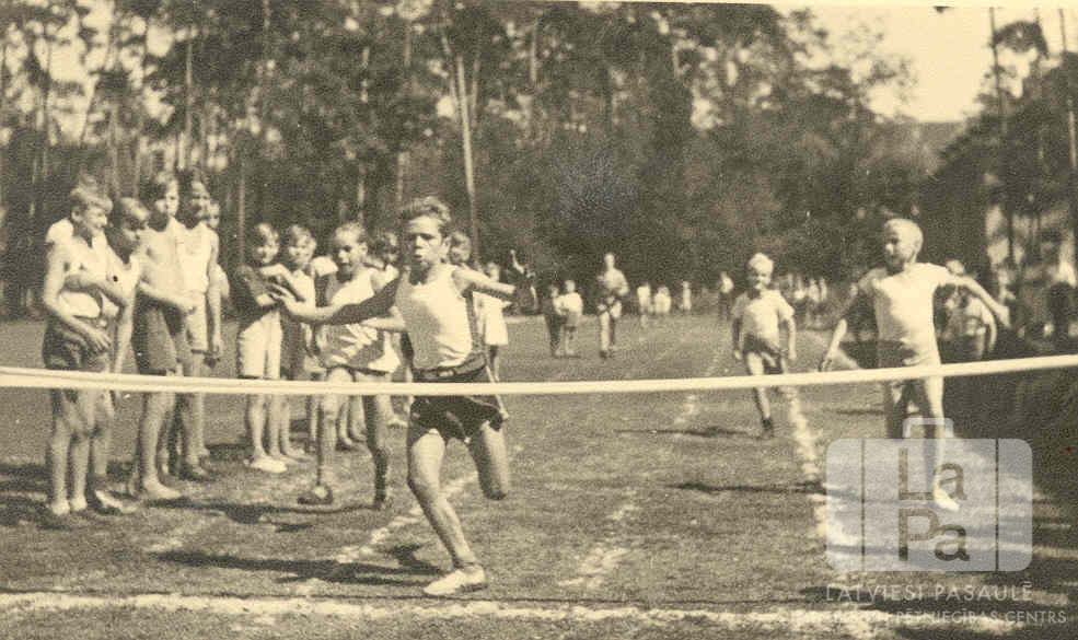Pirmās vietas ieguvējs Gunārs Vītoliņš pie finiša līnijas lentes skriešanas sacensībās jaunatnes sporta svētkos sporta laukumā Karlsrūes nometnē (amerikāņu zonā) 1949. gada vasarā. Gunārs bija Vītoliņu ģimenes sporta zvaigzne. Aizmugurē skrien citi sacensību dalībnieki. Malā stāv skatītāji. Skrejceļš ir iekrāsots ar gaišām līnijām. Fonā ir mežs.