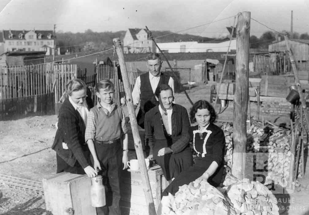 Cilvēku grupa Junkersa nometnē Kaselē (amerikāņu zonā). Vīrietis, trīs sievietes un zēns ar piena kannu rokā. Redzamas veļas auklas un skaldītas, sakrautas malkas rindas, kā arī cits pagalma iekārtojums. Fonā ir koka mietu žogs un vairākas mūra ēkas tālumā. Foto autors: Elmārs Vītoliņš.