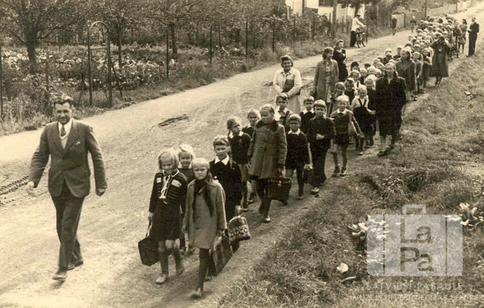 Kaseles nometnes (amerikāņu zonā) tautskolas skolēnu pārgājiens. Gara mazu bērnu kolonna ar pavadoņiem dodas pa ceļu. Bērniem rokās ir somas. Fonā kreisajā malā otrā ielas pusē ir žogs un dārzs. Pieaugušie bērnu kreisajā pusē, no kreisās: pirmais Hugo Tērauds (skolas pārzinis), trešā Agāte Tērauda (skolotāja) un ceturtā Hermīne Reinerta. Pieaugušie bērnu labajā pusē, no kreisās: ? Plūme un Austra Rozenvalde.
