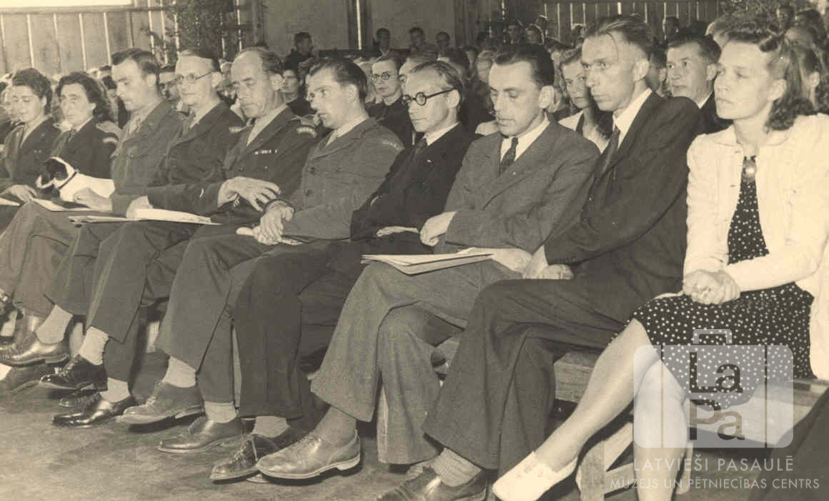 Piemiņas akta dalībnieki sēž vairākās rindās iekštelpās Kaseles nometnē (amerikāņu zonā). Priekšējā rindā vairākiem cilvēkiem ir dokumenti klēpī. Kreisajā pusē starp cilvēkiem ir redzams mazs, gaišs suns. Piemiņas akts tika veltīts 1941. gada 14. jūnijā Padomju Savienības deportētajiem Latvijas iedzīvotājiem. Fonā ir redzamas ēkas dēļu sienas. Ceturtais no labās: Herberts Jurjāns (nometnes priekšnieks).