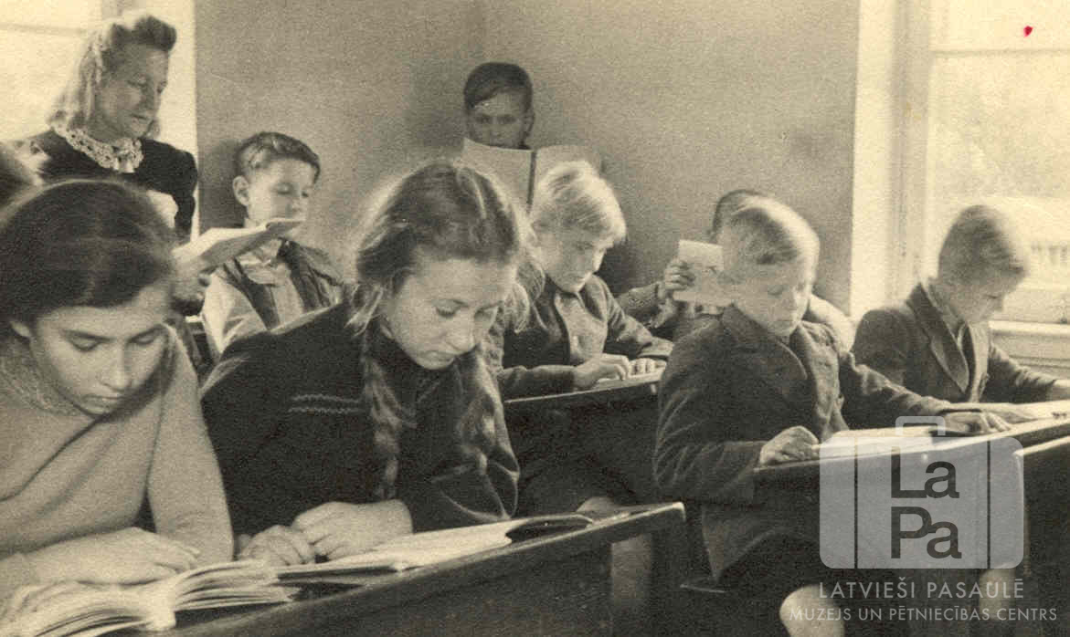 Kaseles nometnes (amerikāņu zonā) pamatskolas klases skolēni lasa grāmatas koka solos 1947. gada rudenī. Aizmugurē stāv H. Reinerte (skolotāja/klases audzinātāja) un Rudolfs Sudmalis (telpas stūrī). Skolēnu rindā ir redzami: Karina Valtere, Mirdza Jākabsone, Uldis Vāgners, Aivars Reinerts un Vitauts Vītoliņš.