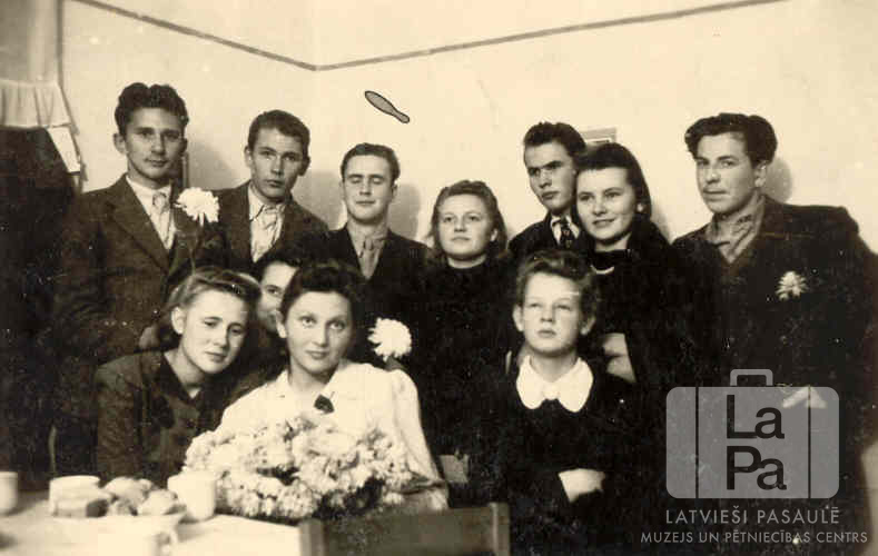 Silvijas Mecas dzimšanas dienas svinības Kaselē (amerikāņu zonā). Pirmās rindas vidū sēž jauniete gaišā tērpā ar ziediem rokās. Priekšplānā kreisajā pusē ir viesību galds ar traukiem un ēdienu. Pirmajā rindā sēž, no kreisās: Millija Lūsiņš, Silvija Meca un Maija Puķīte. Aizmugurē stāv, no kreisās: Elmārs Vītoliņš, Gatis Plūme, Valdis Vagners, Leontine Maculēviča, nezināms, Melizande Kūnauss un Juris Kalve.