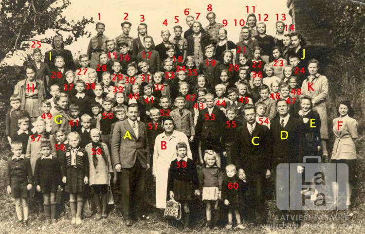 Kaseles nometnes (amerikāņu zonā) tautskolas skolotāji un skolēni 1946.–1947. skolas gadā. Liela cilvēku grupa vairākās rindās stāv uz nogāzes. Uz fotogrāfijas cilvēkiem ir ar sarkanu un dzeltenu krāsu salikti cipari. Skolotāji, apzīmēti ar burtiem: A – Hugo Tērauds (skolas pārzinis), B – Laima Insberga, C – Ādolfs Čops (ticības mācības skolotājs mācītājs), D – Teodors Rudzrogs, E – Hermīne Reinerte, F – Ērika Galiņa, G – Austra Rozenvalde, H – Nagežda Līdums, I – Johanna Plūme, J – Velta Loze, K – Agate Tērauda. Skolēni, apzīmēti ar cipariem: 1 – Elmārs Vītoliņš, 2 – Juris Kalve, 3 – Inta Greize, 4 – Elmārs Lūsiņš, 5 – Heinrichs Puķītis, 6 – Gatis Plūme, 7 – Ināra Kačerovska, 8 – Uldis Rozenbergs, 9 – Rota Tērauda, 10 – Millija Lūsiņš, 11 – Silvija Meca, 12 – Leontine Maculēviča, 13 – Maija Puķīte, 14 – Melizande Kunava, 15 – Uldis Vipulis, 16 – Guntis Bole, 17 – Valdis Vāgners, 18 - nezināms, 19 – Uldis Vāgners, 20 – Mirdza Jākobsone, 21 – Vita Tērauda, 22 – Karena Olekša, 23 – Karīna Valters, 24 – nezināms, 25 – Rūdolfs Štokmanis, 26 - nezināms, 27 – Uldis Miezis, 28 – nezināms, 29 – nezināms, 30 – Jānis Laukirbe, 31 – Harijs Miķelsons, 32 – Daina Jēkabsone, 33 – Vitauts Vītoliņš, 34 – Maruta Stilbe, 35 – Aivars Reinerts, 36 – Ilma Troma, 37 – Kārlis Greizis, Uldis Roze, 38 – Jānis Plūme, 39 – Skaidrīte Roze, 40 – Maija Rītiņa, 41 – Ieva Esariņa, 42 – Aina Jākabsone, 43 – Rasma Jurjāne, 44 – Marija Bagātais, 45 – Maija Jēkabsone, 46 – Ruta Plūme, 47 – Gunārs Vītoliņš, 48 – Velta Puķīte, 49 – Rūdolfs Bērziņš, 50 – Felikss Bērziņš, 51 – Jānis Niedra, 52 – Ziedonis Taube, 53 – Valdis Troms, 54 – Haralds Mecs, 55 – Olģerts Puķītis, 56 – Astrīda Lorberga, 57 – Selita Gusta, 58 – Dace Tilika, 59 – Juta Bērziņa, 60 – Astrīda Čopa, 61 – Oskars Bērziņš.