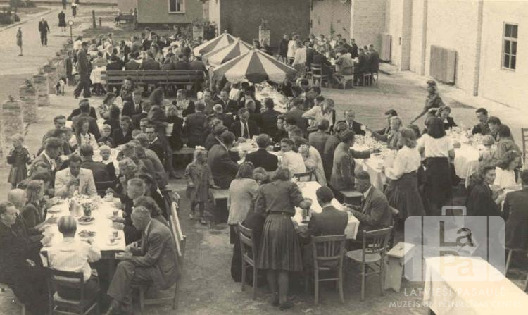 Kaseles nometnes (amerikāņu zonā) iedzīvotāju svinības. Cilvēki ēd pie daudziem viesību galdiem ārpusē. Galdu vidū ir redzami trīs saulessargi. Fonā kreisajā pusē ir iela ar pāris cilvēkiem, labajā pusē ir mūra ēkas. Svinības notika uz betona klona, kas bija palicis no ēkas, ko kara laikā nopostīja.