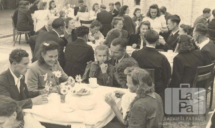 Kaseles nometnes (amerikāņu zonā) iedzīvotāju svinību viesi sēž pie viesību galdiem ārpusē. Uz galdiem ir ziediem vāzēs un ēdienu trauki. Fonā ir ķieģeļu mūra ēkas. Svinības notika uz betona klona, kas bija palicis no ēkas, ko kara laikā nopostīja. Priekšplānā pie galda sēž, no kreisās: pirmais H. Ozoliņš un trešā Maruta Stilbe.