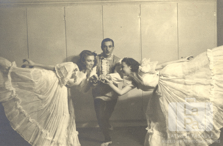 Trīs baleta studijas dejotāji vingro pirms uzveduma Eslingenē (amerikāņu zonā). Jauneklis kostīmā stāv pa vidu divām jaunietēm gaišās, no marles veidotās kleitās.