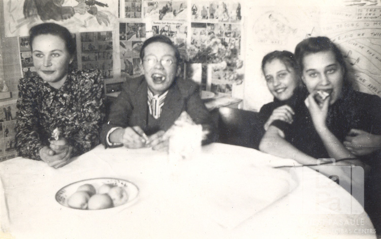 Četri Eslingenes ģimnāzijas (amerikāņu zonā) jaunieši sēž pie galda. Trīs jaunietes un viens jauneklis. Priekšā uz galda ir maza bļoda ar āboliem. Fonā siena ir aplīmēta ar avīzēm un zīmējumiem.