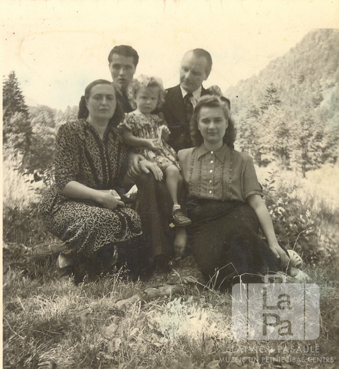 Valteru ģimene no Eslingenes nometnes (amerikāņu zonā) sēž zālē. Tēvs, māte, dēls un divas meitas. Fonā ir mežiem klāta kalna nogāze. Priekšā, no kreisās: ? Valters, Rūta Valters (bērnībā) un Daina Valters. Aizmugurē, no kreisās: Kristaps Valters (vēlāk mācītājs latviešu draudzēs) un Kristaps Valters (prāvests).