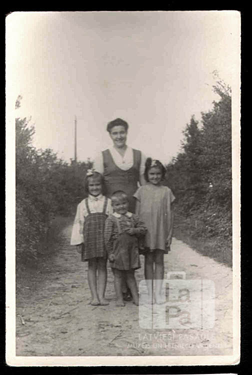 Vizbulīšu ģimene stāv uz takas Švarcenbekā (angļu zonā). Māte, divas jaunas meitas un mazs dēls. Takas abās pusēs ir krūmi. Priekšā, no kreisās: Ina Vizbulīte, Kārlis Vizbulītis un Dagmāra Vizbulīte.