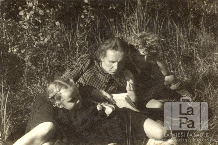 Sieviete ar diviem maziem bērniem saulainā dienā guļ zālē Fallingbostelē (angļu zonā). Sievietei rokās ir grāmata. No kreisās: Zigrīda Lindemanis (bērnībā), Alma Lindemanis (ar grāmatu) un Arnis Kūls (bērnībā).