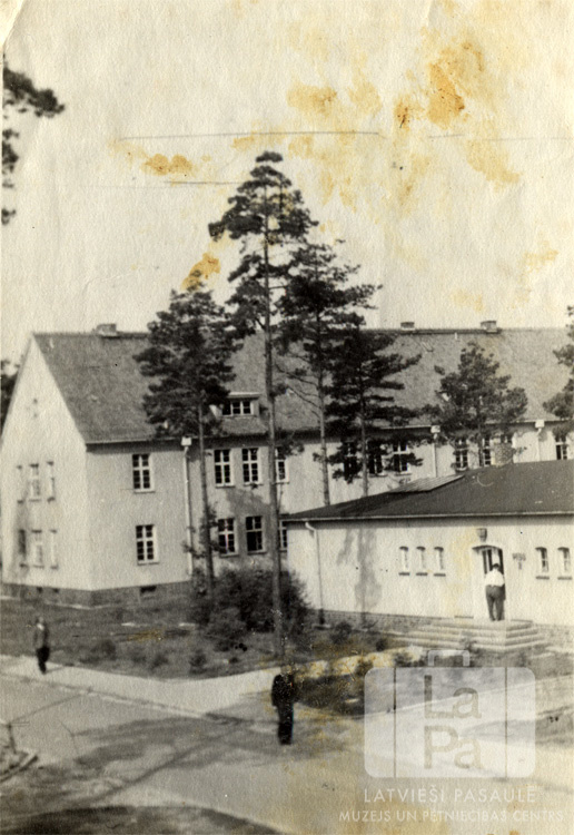 Mūra ēkas ielas malā Fallingbosteles nometnē (angļu zonā). Priekšā ir vienstāvu ēka, aiz tās ir divstāvu dzīvojamā ēka. Pie ēkām pa ceļu pastaigājas cilvēki. Ielas malā un starp ēkām aug priedes. Skats no augšas.