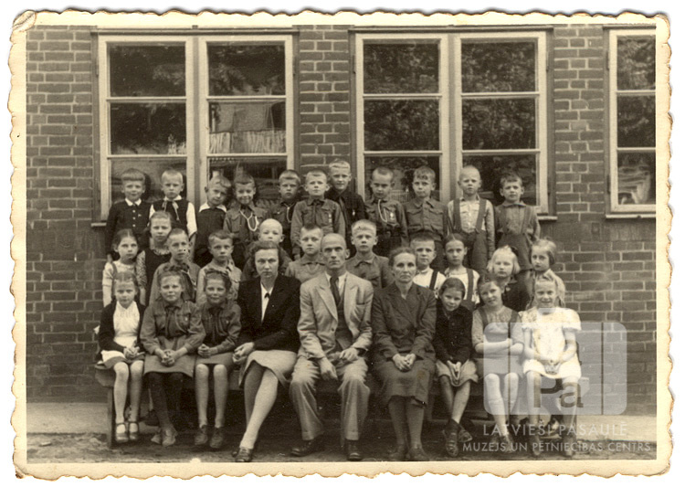 Mazi skolēni ar skolotājiem trīs rindās Iceho nometnē (angļu zonā) ap 1947. gadu. Skolotāji sēž pirmās rindas vidū. Fonā ir ķieģeļu ēkas logi. Pirmajā rindā, no kreisās: piektais Andrejs Ozoliņš un sestā Alma Lindemanis.
