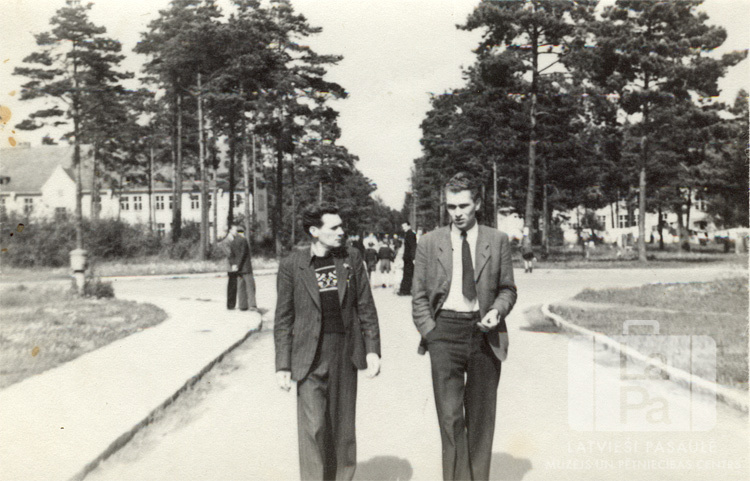 Divi jauni vīrieši žaketēs staigā pa ielu Fallingbosteles nometnē (angļu zonā). Aizmugurē ir ielas krustojums ar cilvēkiem. Ielas malās ir zālājs. Fonā abās ielas pusēs ir mazstāvu dzīvojamās mūra ēkas un priedes. No kreisās: Jerry ? (angļu zaldāts) un Ansis Lindemanis.