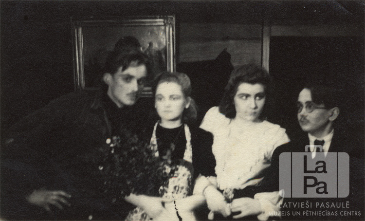 Četri teātra aktieri kostīmos un grimā stāv uz skatuves Iceho nometnē (angļu zonā) ap 1947. gadu. Divi puiši un divas jaunietes, saķērušies rokās. Viens jauneklis rokās tur zaru slotu. Fonā dekorācijas attēlo guļbaļķu ēkas iekšpusi ar gleznu pie sienas un durvju/ loga aili. No kreisās: pirmais Andris Miglis un ceturtais Eduards Lindemanis.