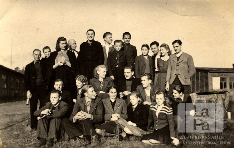 Iceho nometnes (angļu zonā) iedzīvotāju grupa nometnes laukumā ap 1947. gadu. Pirmās divas rindas priekšā sēž, aizmugurē cilvēki stāv kājās. Fonā ir vienstāvu koka barakas.