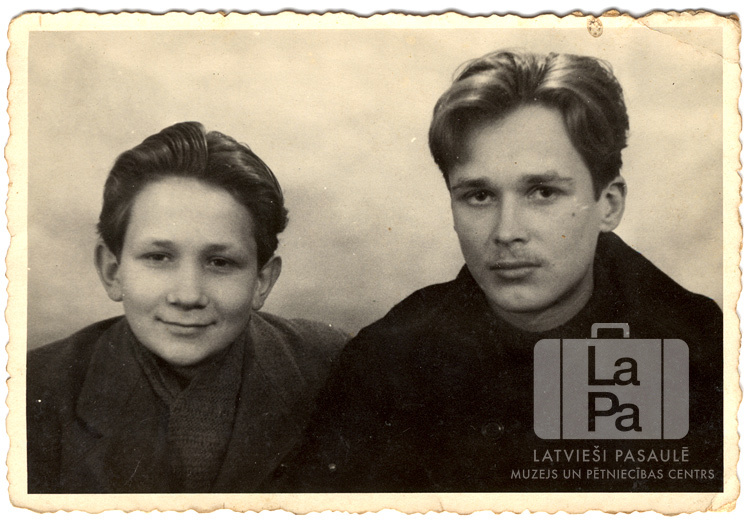 Divi smaidoši jaunekļi Iceho (angļu zonā) ap 1947. gadu. Jaunekļi ir ģērbušies tumšos mēteļos. No kreisās: Eduards Lindemanis, Andris Miglis.