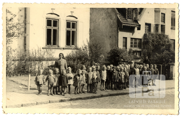 Iceho nometnes (angļu zonā) bērnudārza bērni ar audzinātāju stāv rindā uz trotuāra bruģētas ielas malā ap 1947. gadu. Fonā ir dzīvojamās mūra ēkas.