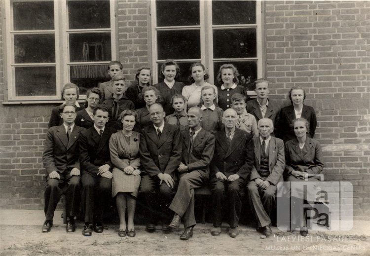 Iceho nometnes (angļu zonā) izlaiduma klase ar skolotājiem 1946.–1947. mācību gadā. Jaunieši ar skolotājiem trīs rindās. Priekšā sēž skolotāji, skolēni stāv aizmugurē. Fonā ir ķieģeļu mūra ēkas logi. Pirmajā rindā, no kreisās: otrais Zīds, trešā Zīda kundze, piektais Andrejs Ozoliņš un astotā Alma Lindemanis.