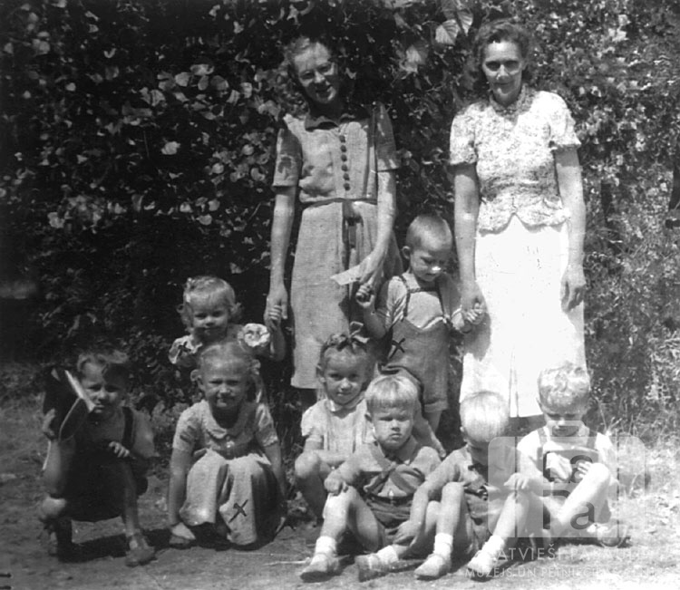 Bērnudārza bērni ar audzinātājām Dedelstorfas nometnē (angļu zonā). Bērni priekšā sēž un ir notupušies uz zemes; viens zēns kreisajā pusē rokā tur grāmatu (?). Divas sievietes ar mazu zēnu stāv aizmugurē. Fonā ir krūmi. Aizmugurē, no kreisās: Aina Zichmanis un Krūmiņa jaunkundze. Bērnu vidū ir redzami: Laima Zichmanis, Zīle Zichmanis, Klāvs Zichmanis un Ilze Svenne.