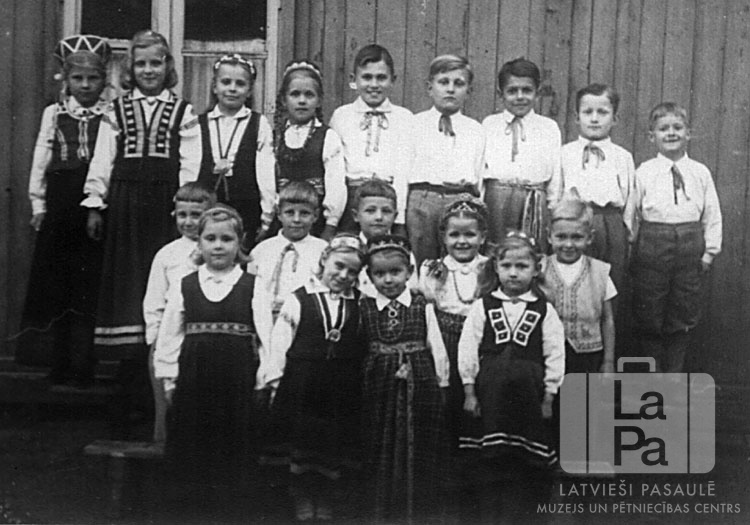 Skolēnu tautas deju grupas "Diždancis" dalībnieki stāv pie koka ēkas Melles nometnē (angļu zonā). Mazi zēni un meitenes tautastērpos trīs rindās.