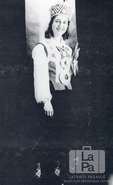 Mūzikas skolas direktores Elzas Mekšs (dz. Kalniņas) portrets tautastērpā Eslingenē (amerikāņu zonā), kad viņa dziedāja kantāti 1947. gada dziesmu svētkos. Sievietei galvā ir izrakstīts kronis.