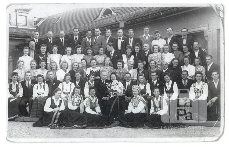 Eslingenes nometnes (angļu zonā) koris un viesi Nellijas Rumbas kāzu dienā. Liela cilvēku grupa vairākās rindās. Priekšā sēž sievietes tautastērpos. Jaunais pāris sēž otrās rindas vidū. Fonā ir zemas mūra ēka ar dakstiņu jumtu. Otrajā rindā, devītā no kreisās: Nellija Rumba (ar ziediem rokās).