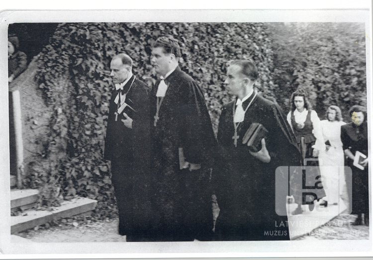 Trīs mācītāji amata tērpos iesvētību dienā Eslingenē (amerikāņu zonā). Aiz mācītājiem labajā pusē soļo trīs jaunas sievietes, viena ir ģērbusies tautastērpā. Fonā ir ar vīteņaugiem apaudzis mūris. Priekšā, no kreisās: pirmais Jēkabs Mekšs, otrais Artūrs Piebalgs un trešais Kārlis Bilzens.
