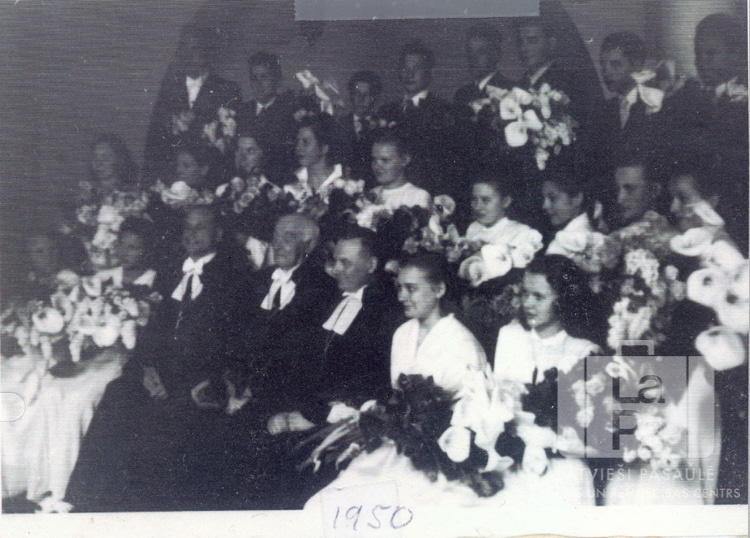 Jaunieši ar mācītājiem iesvētībās Eslingenē (amerikāņu zonā). Jaunieši trīs rindās ar ziediem rokās. Pirmajās divās rindās ir jaunietes gaišās kleitās, pēdējā rindā stāv jaunekļi uzvalkos. Pirmās rindas vidū sēž mācītāji amata tērpos. Uz fotogrāfijas ir līmlentes paliekas. Zem fotogrāfijas ir gadskaitlis: "1950". Pirmajā rindā sēž, no kreisās: otrā Malda Zaija Mekšs (pr. Kēlere), trešais Jēkabs Mekšs (mācītājs), ceturtais Teodors Grīnbergs (arhibīskaps), piektais Kristaps Valters (prāvests) un sestā Daina Valters.