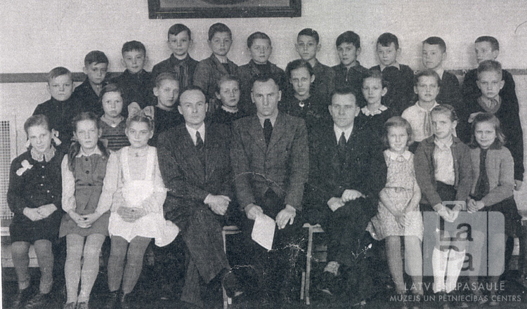 Eslingenes (amerikāņu zonā) pamatskolas 3.d klases skolēni ar skolotājiem. Bērni trīs rindās. Pirmā rinda sēž uz krēsliem, ar trīs vīriešiem rindas vidū. Pirmajā rindā, no kreisās: Ilga ?, Aija Polis, Ināra Ērlichs, Jānis Vinters (skolas direktors), Emīls Mazutis (klases audzinātājs), Alberts Azacis (direktora palīgs), Astrīda Biltaurs, Māra Izaks un Ruta Barbins. Otrajā rindā, no kreisās: Valids Apinis, Astrīda Krūmiņš, Gundega Silēvičs, Agnese Kalacis, Inta Vāczemnieks, Valda Kānbergs, Zinta Mekšs (pr. Kūlīte) un Jānis Kadilis. Trešajā rindā, no kreisās: Juris Kļāviņš, Jānis Vīķis, Juris Bērziņš, Varis Švalbe, nezināms, Varidots Mekšs, Alfons ?, Jānis Krasovskis, Jānis Liepiņš un Tālivaldis Lībants.