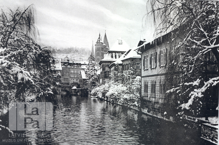 Ziemas ainava ar kanālu Eslingenē (amerikāņu zonā). Kanāla malās ir apsniguši koki un pilsētas ēkas. Fonā aiz ēkām ir redzams sniegots, zems kalns.