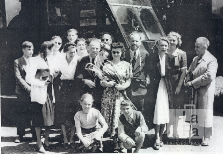 Cilvēku grupa saulainā dienā vilciena stacijā, atstājot Eslingeni (amerikāņu zonā). Sievietei vidū rokās ir ziedi. Priekšā ir notupušies divi bērni. Cilvēkiem aizmugurē ir automašīna. Otrajā rindā, no kreisās: Velta Baravika (ar somu rokās), Elza Mekšs (dz. Kalniņa), Jānis Vinters (pamatskolas direktors), Vintera kundze (ar ziediem rokās), Jēkabs Mekšs (mācītājs), nezināms, nezināms, ? Vasulis (skolotājs). Priekšā, no kreisās: Zinta Mekšs (pr. Kūlīte) un Varidots Mekšs.