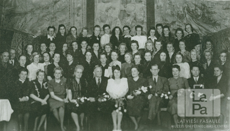 Pārkvalificēšanās kursu absolventu grupa iekštelpās Eslingenē (amerikāņu zonā) 1948.–1949. gadā. Pirmā rinda sēž uz krēsliem, vairākiem cilvēkiem klēpī ir ziedi. Pārējās trīs rindas stāv kājās. Pirmajā rindā, no kreisās: otrā Vanda Aizkaraukle (doktore), trešā Anna Spāle, sestā Zuzanna Kalniņa (kolonijas vecākā sieva), septītā ? Dzelzgalve (skaistumkopšanas pasniedzēja), astotais Kārlis Kalniņš (kolonijas vecākais) un devītā ? Bērziņa. Otrajā rindā, no kreisās: pirmais Jānis Porietis (redaktors), trešā ? Banga (skolotāja), ceturtā ? Laure, sestā Rasma Prande un desmitā Savele. Trešajā rindā, no kreisās: septītā ? Vintere. Ceturtajā rindā, no kreisās: pirmā Ģertrūde Blūma, trešā Elza Mekšs (dz. Kalniņa), septītā ? Liepiņa, desmitā Velta Baravika, vienpadsmitā ? Birzgale un četrpadsmitā Mirdza Bērziņa.