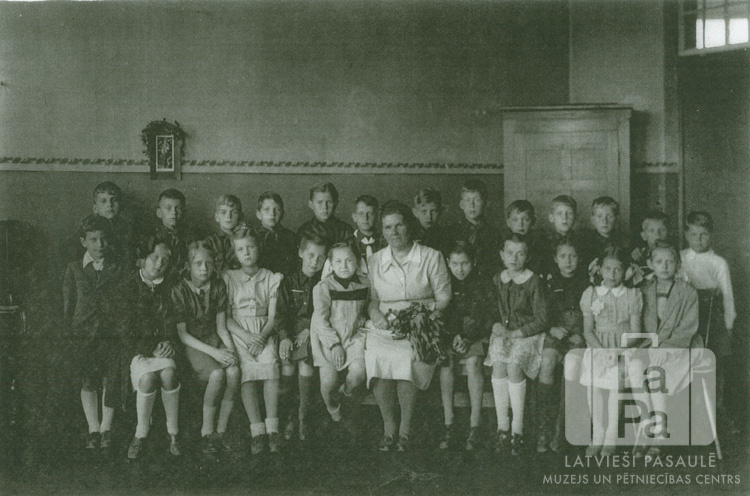 Eslingenes (amerikāņu zonā) pamatskolas 3. klases skolēni ar audzinātāju iekštelpās. Pirmā rinda sēž uz krēsliem ar audzinātāju vidū. Otrā rinda aizmugurē stāv kājās. Fonā pie sienas ir mazs attēls un koka skapis telpas stūrī. Pirmajā rindā, septītā no kreisās: ? Krīgere (klases audzinātāja). Pirmajā rindā vēl ir redzami: Ināra Laure, Ausma Upatniece, Mudīte Kļaviņa, Ruta Barbina, Skaidrīte Raune, Beāte Blonska, Ingrīda Švūkste un Vineta Valtenberga. Otrajā rindā ir redzami: Māris Zemmers, Kārlis Rūtiņš, Varis Pūce, Mārtiņš Ezernieks, Juris Kēlers, Artūrs Strēle un Kaspars Krēsliņš.