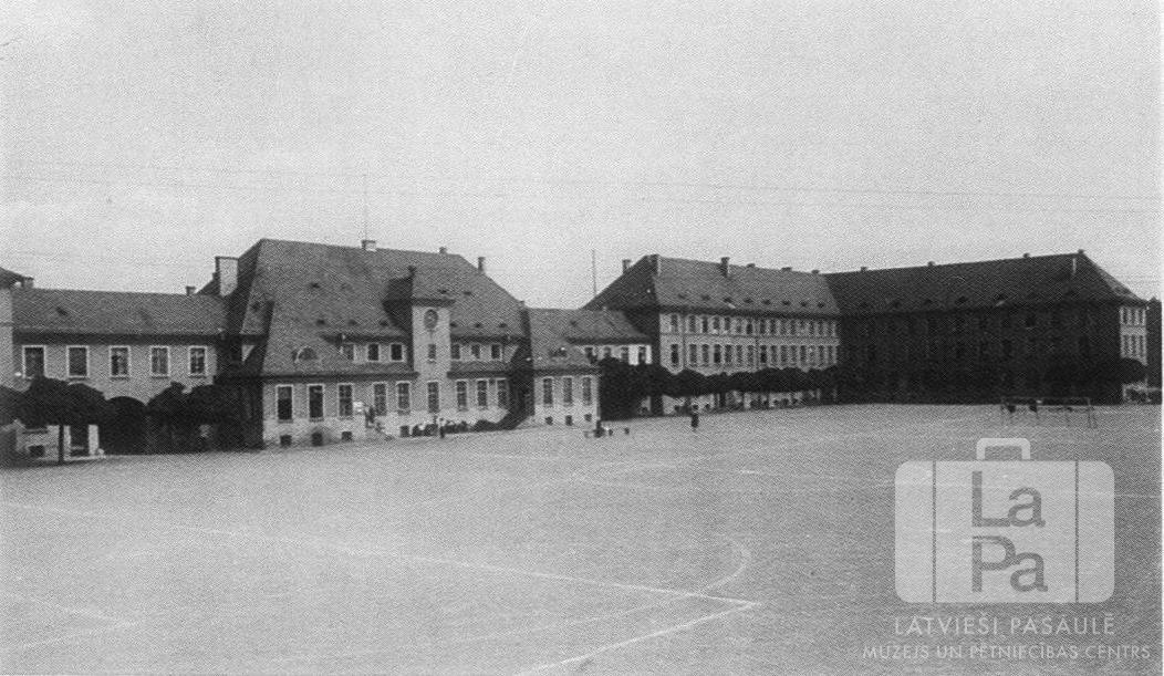 Laukums Eslingenes nometnes kalna kopienā (amerikāņu zonā). Laukuma malās ir vairākas divu un trīs stāvu mūra ēkas ar zemām koku rindām priekšā. Laukuma labajā pusē ir redzami futbola vārti.