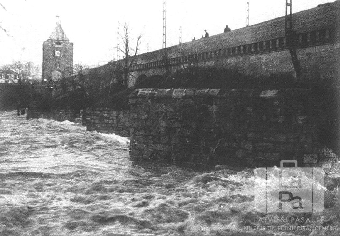 Akmens mūra tilts pāri straujajai Nekāras upei Eslingenē (amerikāņu zonā) pavasarī. Uz tilta aizsargvaļņiem aug koki bez lapām. Pāri tiltam dodas gājēji. Kreisajā pusē ir redzama mūra baznīca.