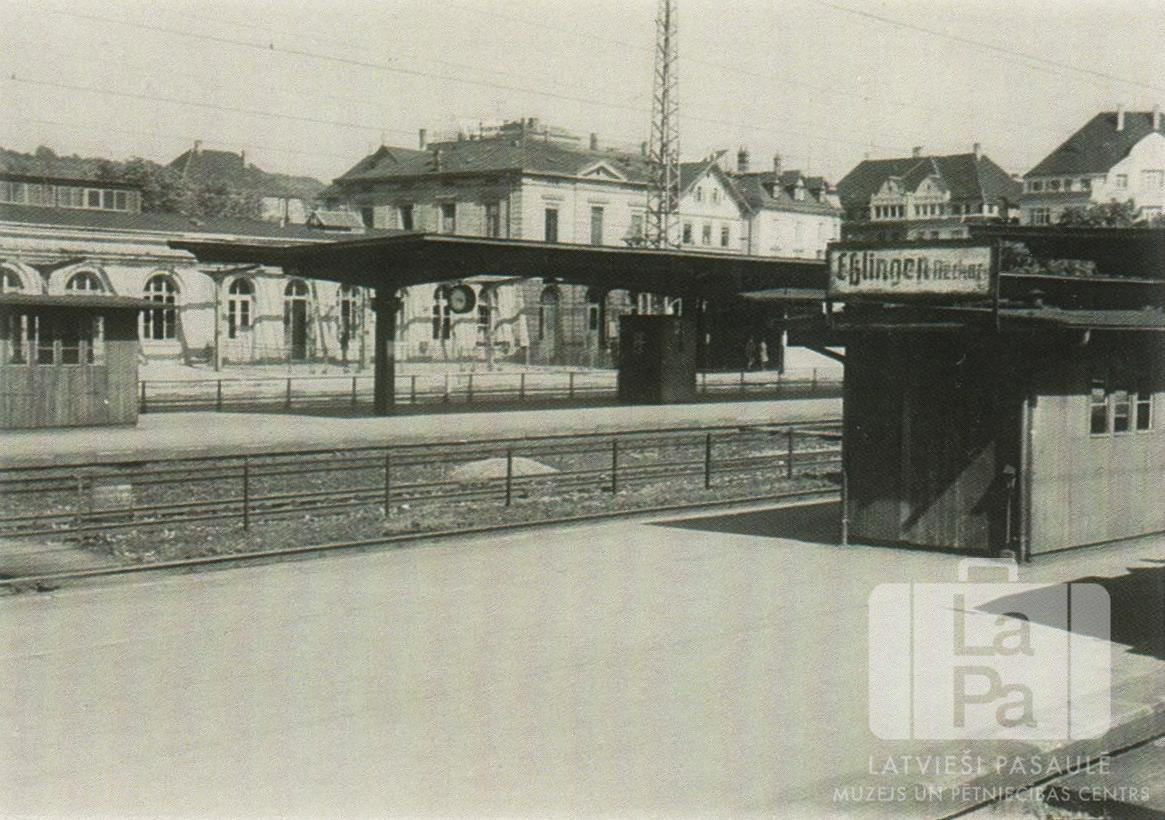 Dzelzceļa stacija Eslingenē (amerikāņu zonā). Redzami divi stacijas peroni ar sliedēm un žogu pa vidu. Priekšplānā ir neliela vienstāvu koka būda, uz kuras ir zīme "Eßlingen". Dzelzceļa malā ir vairākas mūra ēkas.