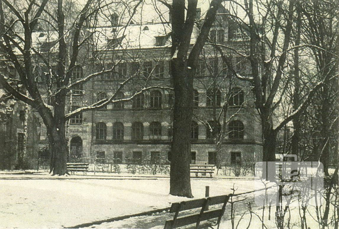 Četrstāvu mūra pilsskolas ("Burgschule") ēka Eslingenes nometnē (amerikāņu zonā) ziemas laikā. Ēkā atradās nometnes ģimnāzija un latviešu reģistrēšanās centrs, kā arī tā bija mājvieta apmēram 300 latviešu bēgļiem. Ēkas priekšā ir neliels apsnidzis parks ar soliem, takām un kokiem bez lapām.
