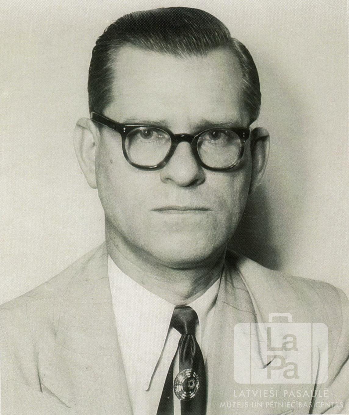 Kolonijas vecākā, mag. oec. Kārļa Kalniņa portrets Eslingenē (amerikāņu zonā). Pusmūža vīrietis gaišā uzvalkā ar tumšu kaklasaiti, tumšām brillēm un īsiem, gludi pieglaustiem tumšiem matiem.