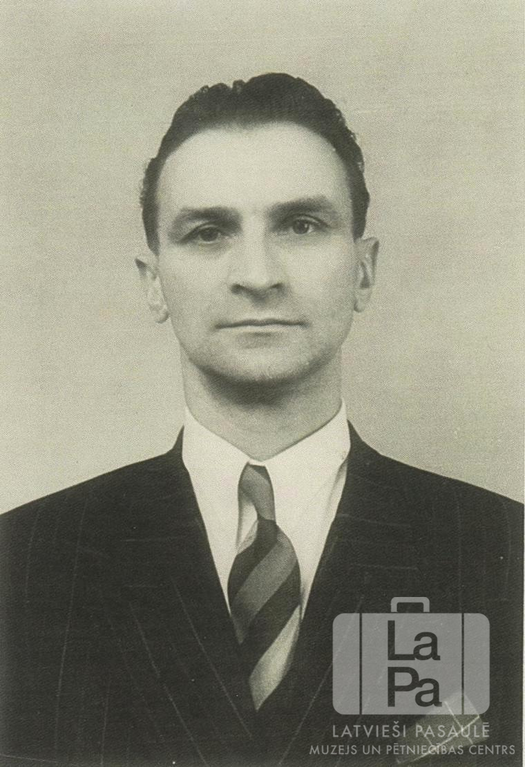 Kolonijas vecākā padomieša, mag. iur. Jāņa Aperāna portrets Eslingenē (amerikāņu zonā). Pusmūža vīrietis tumšā uzvalkā ar svītrainu kaklasaiti un īsiem, gludi pieglaustiem tumšiem matiem.