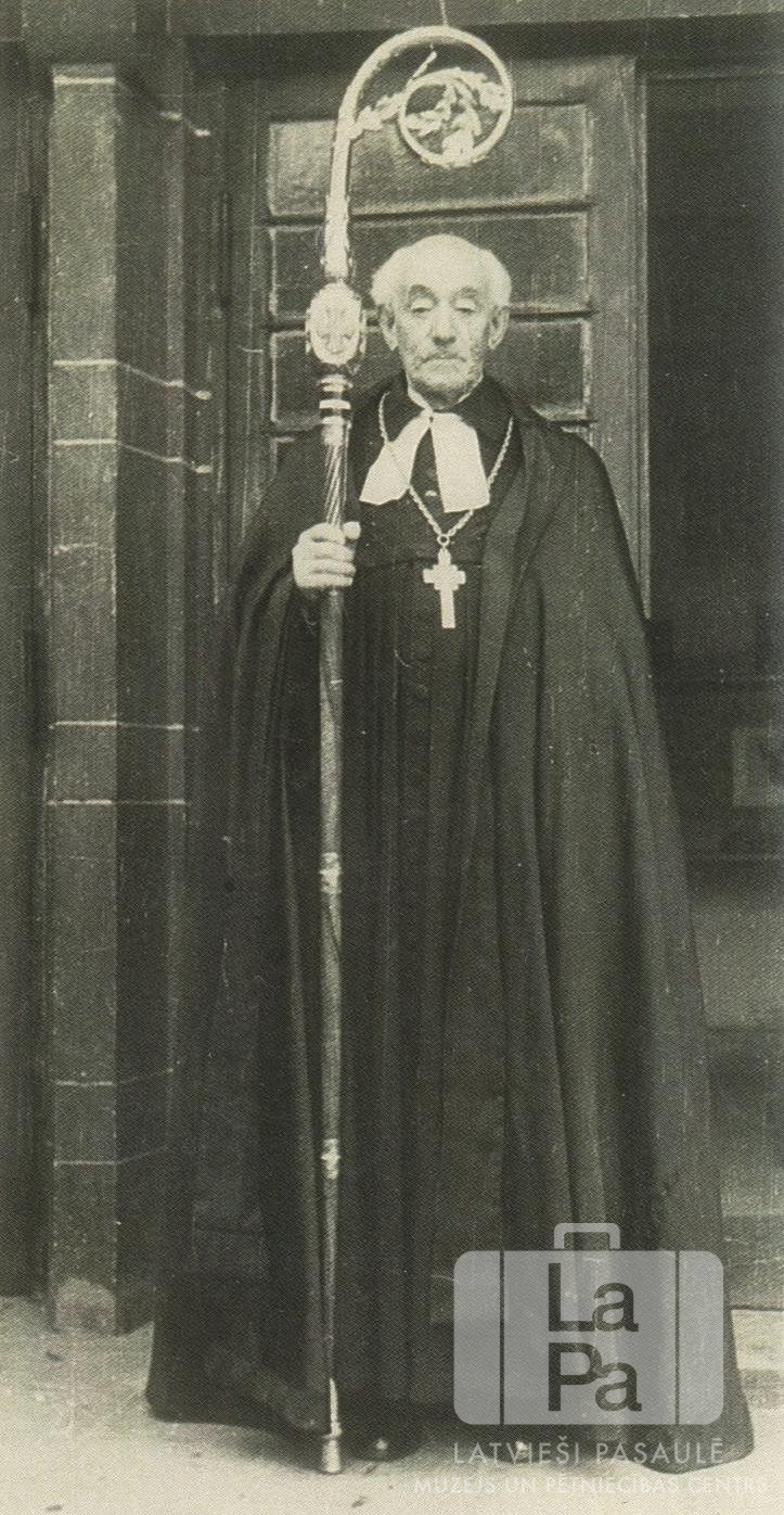 Arhibīskaps Teodors Grīnbergs garīdznieka amata tērpā un scepteri rokā stāv ēkas durvju priekšā Eslingenē (amerikāņu zonā). Par šo gadījumu Zinta Kūlīte (dz. Mekšs) stāsta: "Archibīskapa Dr. Teodora Grīnberga atdusas vieta ir Esslingenas "Pliensaufriedhof" kapsēta, netālu no Dienvidu baznīcas. Galvenā latviešu bēgļu kapsēta bija "Ebershaldenfriedhof" kapsētā."