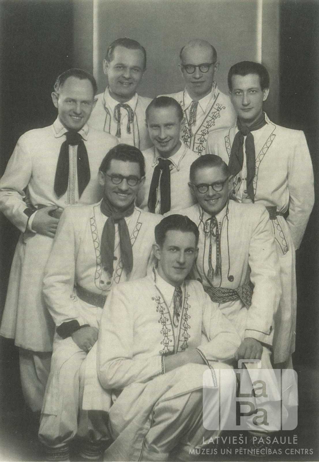Eslingenes (amerikāņu zonā) dubultkvartets “Tēvija”. Astoņi smaidīgi vīrieši gaišos tērpos ar tumšām prievītēm un kaklautiem iekštelpās. Pirmajā rindā sēž: Andris Bērziņš. Otrajā rindā, otrais no kreisās: Jānis Austrums. Trešajā rindā, pirmais no kreisās: ? Skujiņš. Ceturtajā rindā, pirmais no kreisās: Bertolds Akers.
