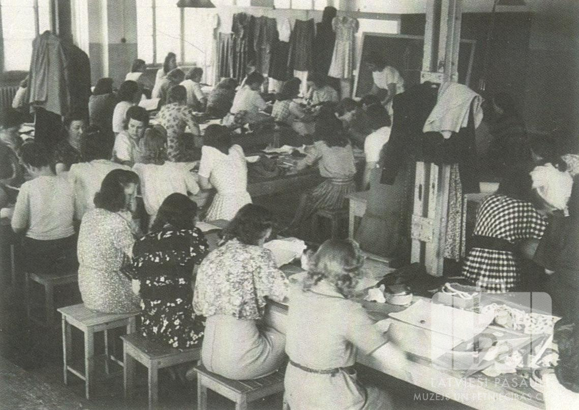 Sievietes sēž pie gariem galdiem šūšanas kursos Eslingenē (amerikāņu zonā) pārskološanās laikā. Uz galdiem ir audumi un šūšanas piederumi. Telpā pie balstiem un sienām karājas gatavi apģērba gabali. Par šo gadījumu Zinta Kūlīte (dz. Mekšs) stāsta: "Bēgļiem bija ļoti labas iespējas iemācīties vairākus jaunus darbus, lai tos izmantotu dzīvē jaunajās zemēs."