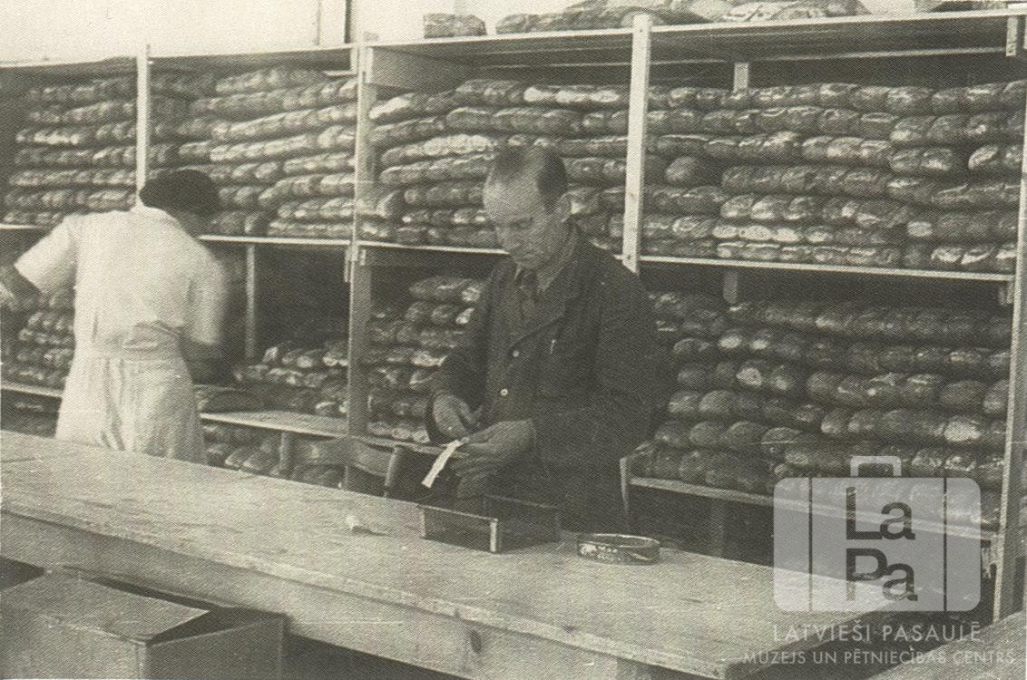 Divi darbinieki pie maizes kukuļu plauktiem Eslingenē (amerikāņu zonā). Vīrietis stāv priekšā pie koka letes, sieviete gaišā halātā stāv ar muguru pret fotogrāfu. Iespējams, tā ir maizes ceptuve vai pārtikas sadales vieta.